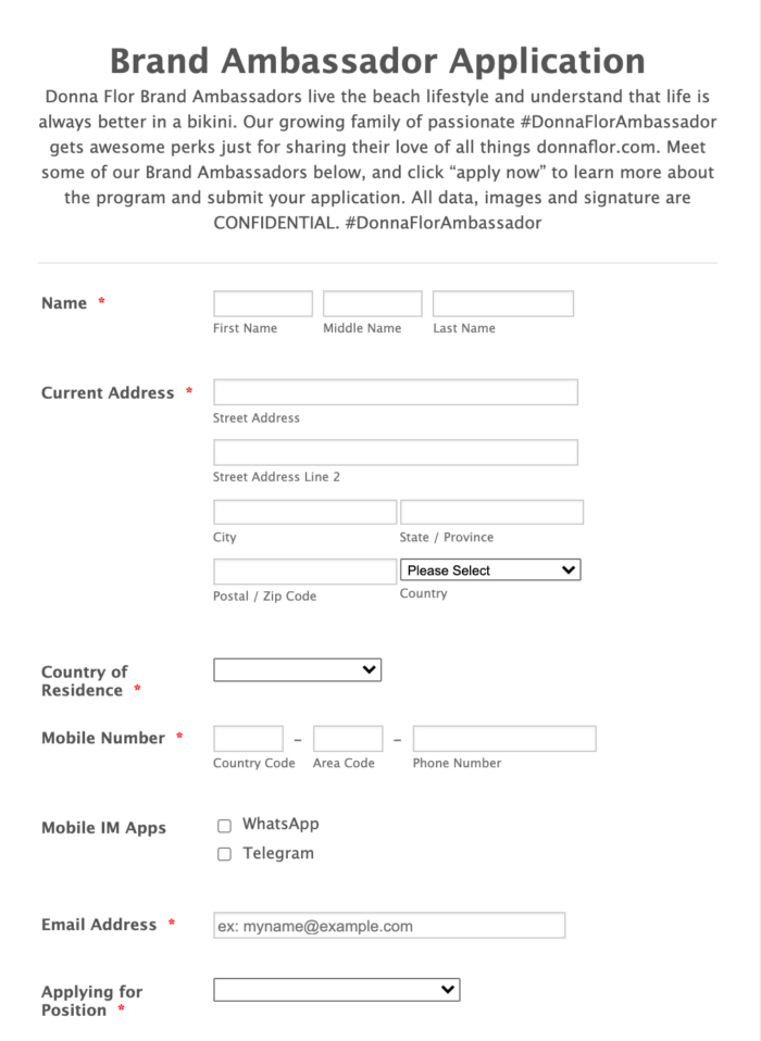 Vestique uses a Jotform brand ambassador application template customized to collect the information they need. Jotform also has brand ambassador contract templates for when you’re ready to seal the deal with someone.