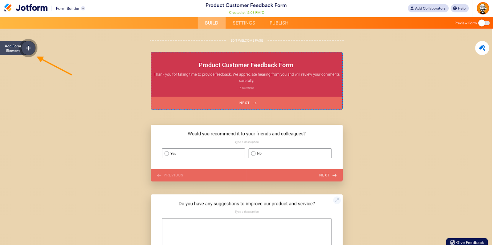 From Jotform’s Form Builder, click on the Add Form Element button on the left.