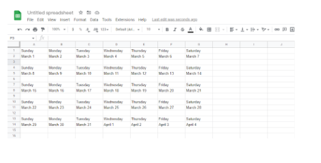 If you’re making a weekly calendar, you can stop right there. If you want a monthly calendar, you can skip a row and repeat the same process until you have five separate weeks represented in your spreadsheet. This will be more than enough to represent any month of the year.