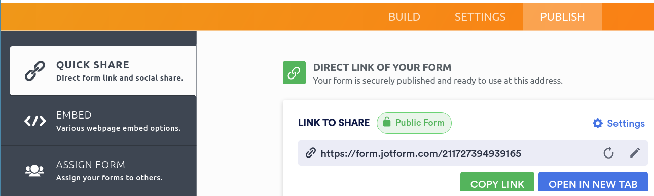 Now head back to Jotform to grab the code you’re going to embed. Start by clicking Publish in the orange bar above your form. That should start you off in the Quick Share tab on the left. In the main page area, there’s a Link to Share. Click Copy Link.