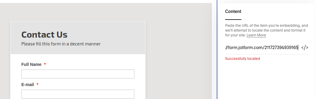 Go back to the Squarespace tab and paste your link. Within a few seconds you should see a message that says, “Successfully located.” A few more seconds later, a preview of your form will appear.