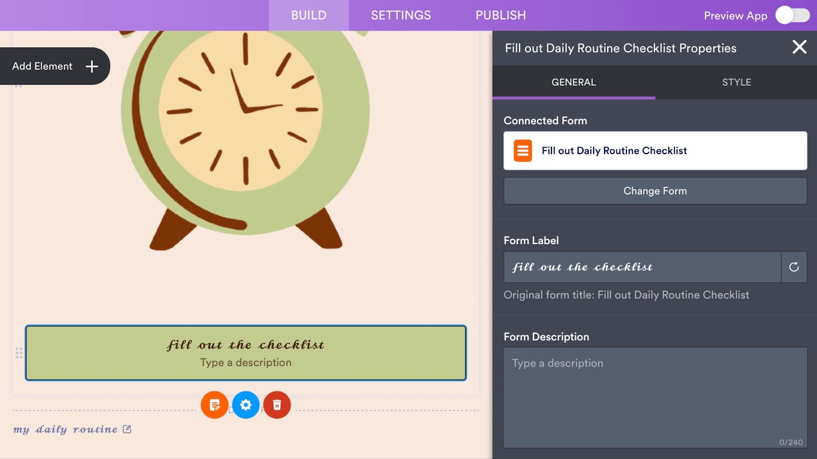 - Find the Form element in your template. In this case, the element says Fill out the checklist.