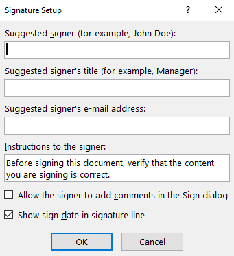 You can create a pre-formatted signature line that includes the signer’s name, title, and other details. Use this feature if you know all of the individuals who will be signing your petition. In the Insert tab, click on Signature Line and fill out the fields in the popup.