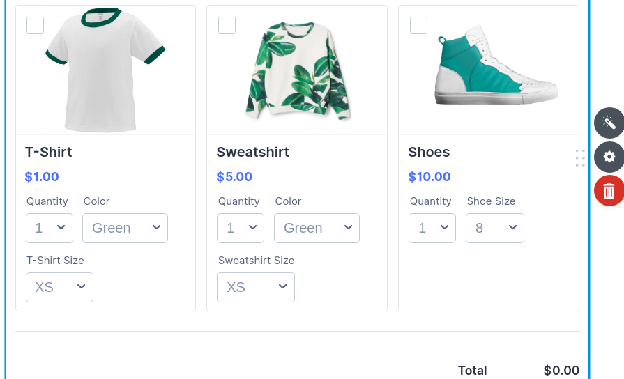 There are three items on offer, each with its own custom price and options for sizes and colors. Select that form element by clicking on it and then click the magic wand icon to see how these items are configured.