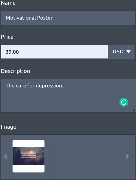 Now that we have a basic understanding of this form element, let’s add our painting by clicking Create New Product. Then give it a name, select a price, and add a description. Then add an image.
