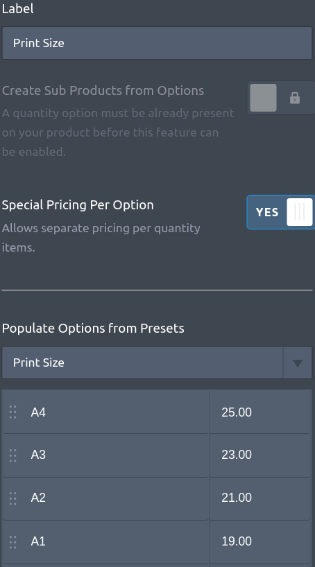 Next, add a product option. Label the option as “Print Size” and turn on Special Pricing Per Option. It just so happens that there’s a preset for print sizes. Select Print Size from the presets dropdown and set the prices for each option.