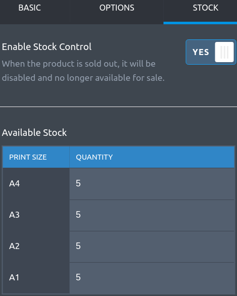 When you’re done, hit Back, go to the Stock tab, and enable stock control. Set each quantity to five to allow for a total of 20 prints and save it.