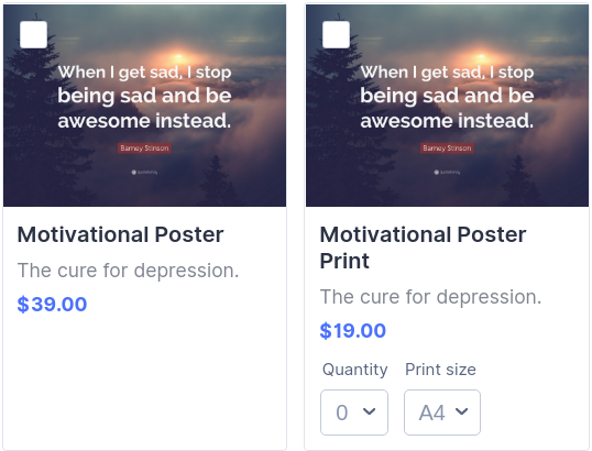 To keep people from buying out our whole stock of prints at once, go to the Options tab and add a quantity selector. Choose to show the quantity as a dropdown and set the range from 0 to 1, then save it.