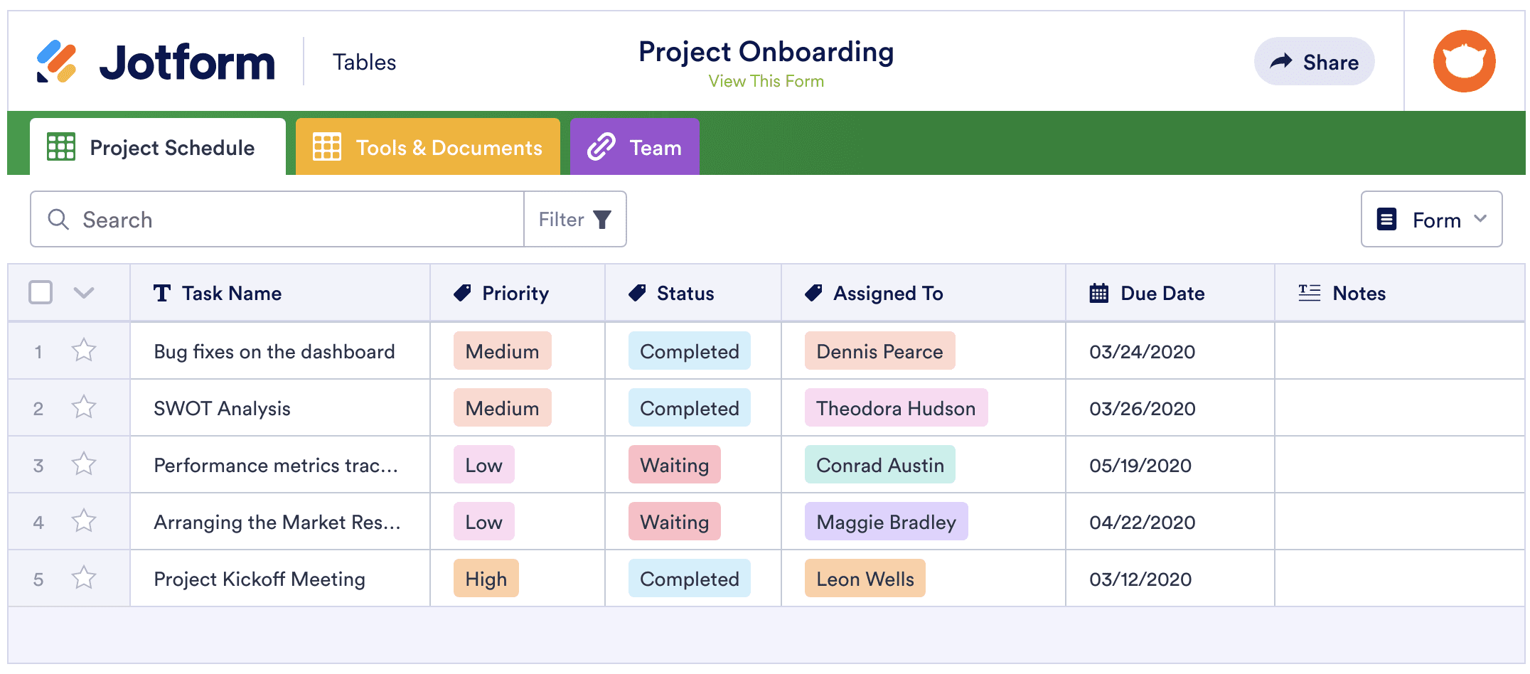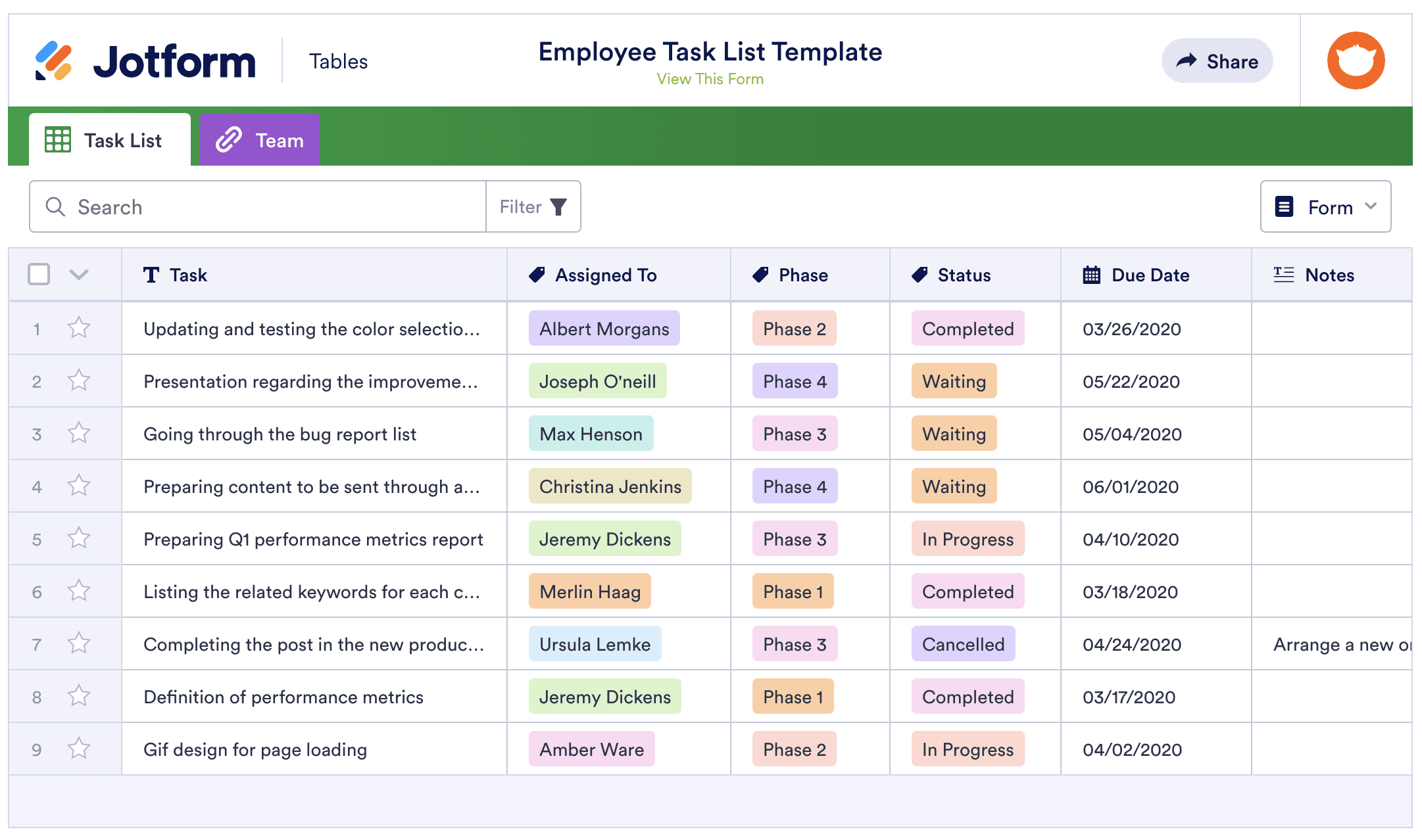 Not every team will benefit from a complicated project board with dozens of columns to update, so it’s up to you to decide what works best for the majority. If you’re looking for a free option to test the waters, Jotform offers a great way to manage team tasks with Jotform Tables.