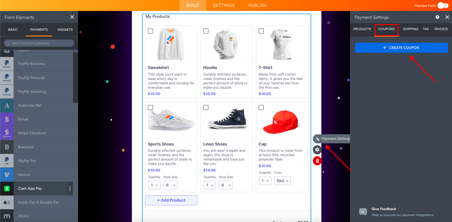 The coupon feature allows you to create custom coupon codes that will automatically apply discounts (either a percentage or fixed amount), calculate total costs with conditional form logic, and receive payments with your choice of integration.