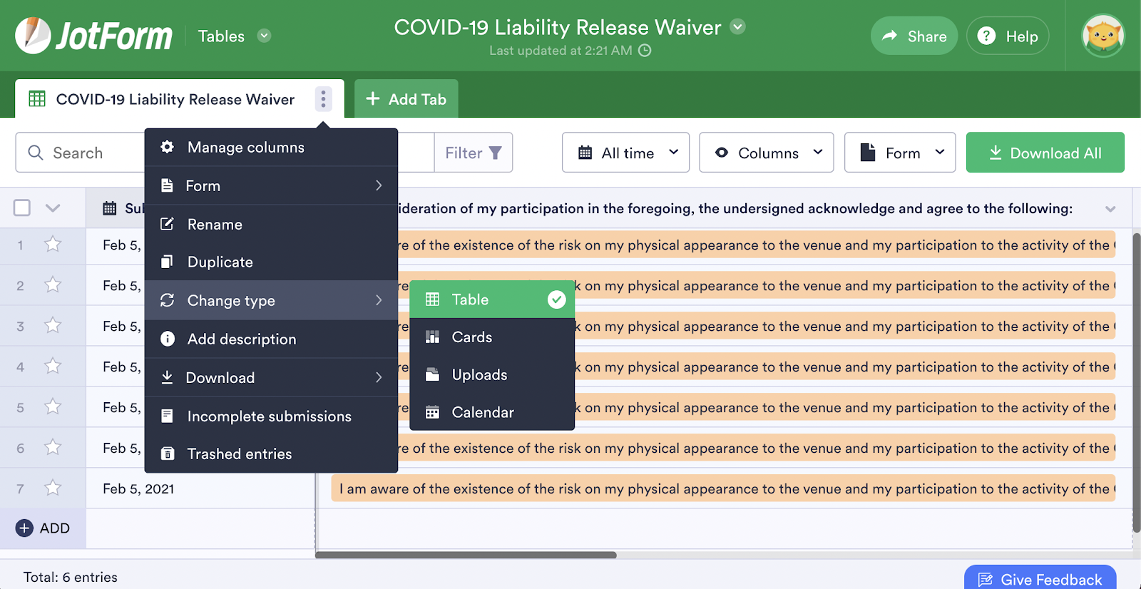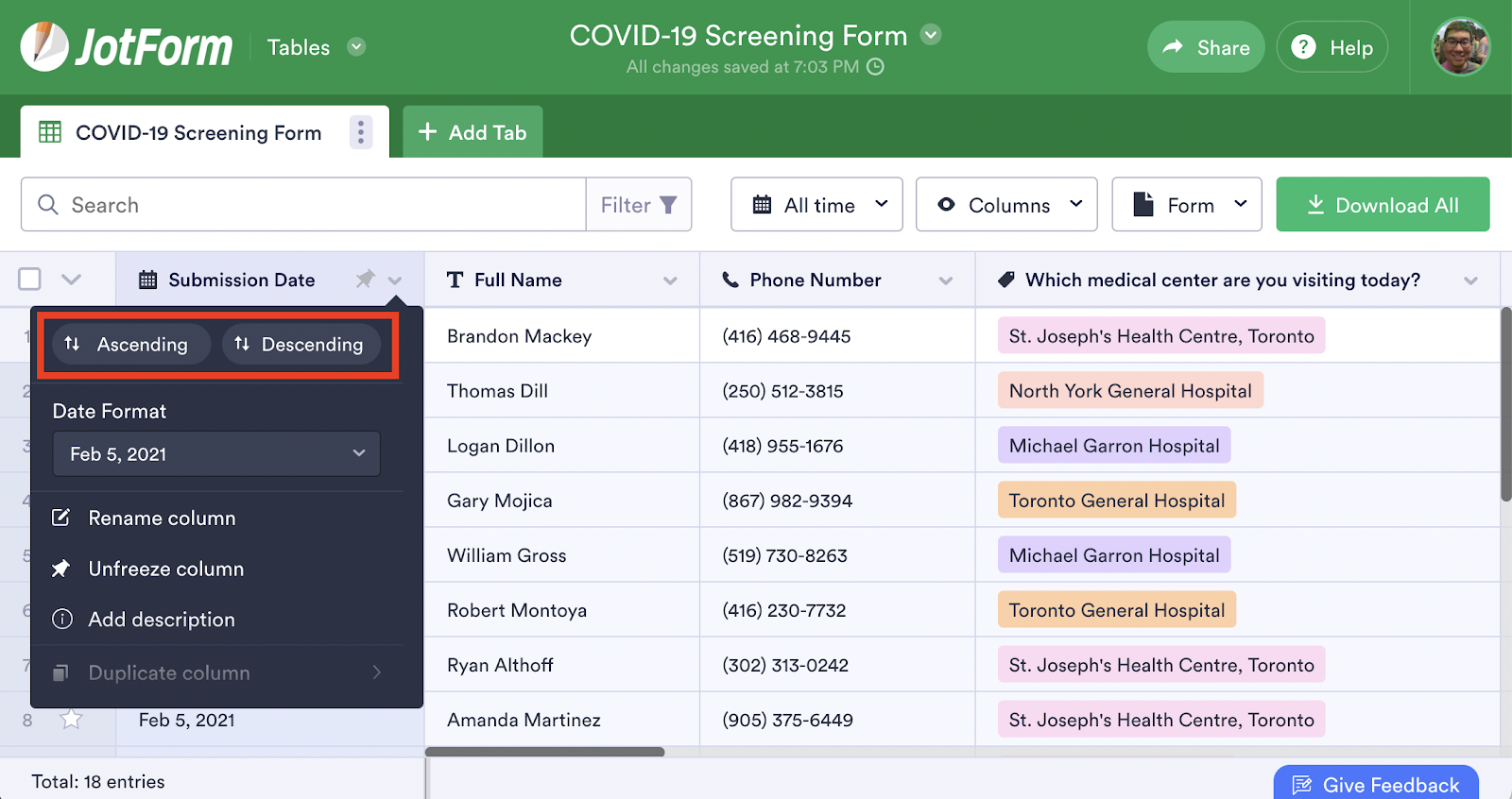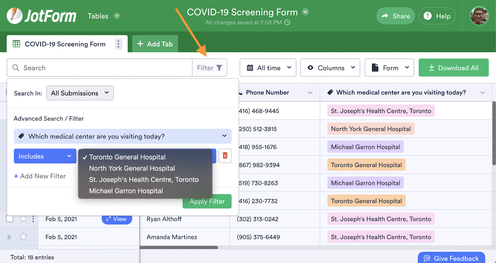 The Jotform Tables workspace that’s connected to your screening form lets you monitor responses in real time. You can even use Jotform Tables’s filter feature to see whether anyone may have COVID-19 symptoms or high risk factors for a coronavirus infection, such as recent travel or close contact with someone who may be infected.