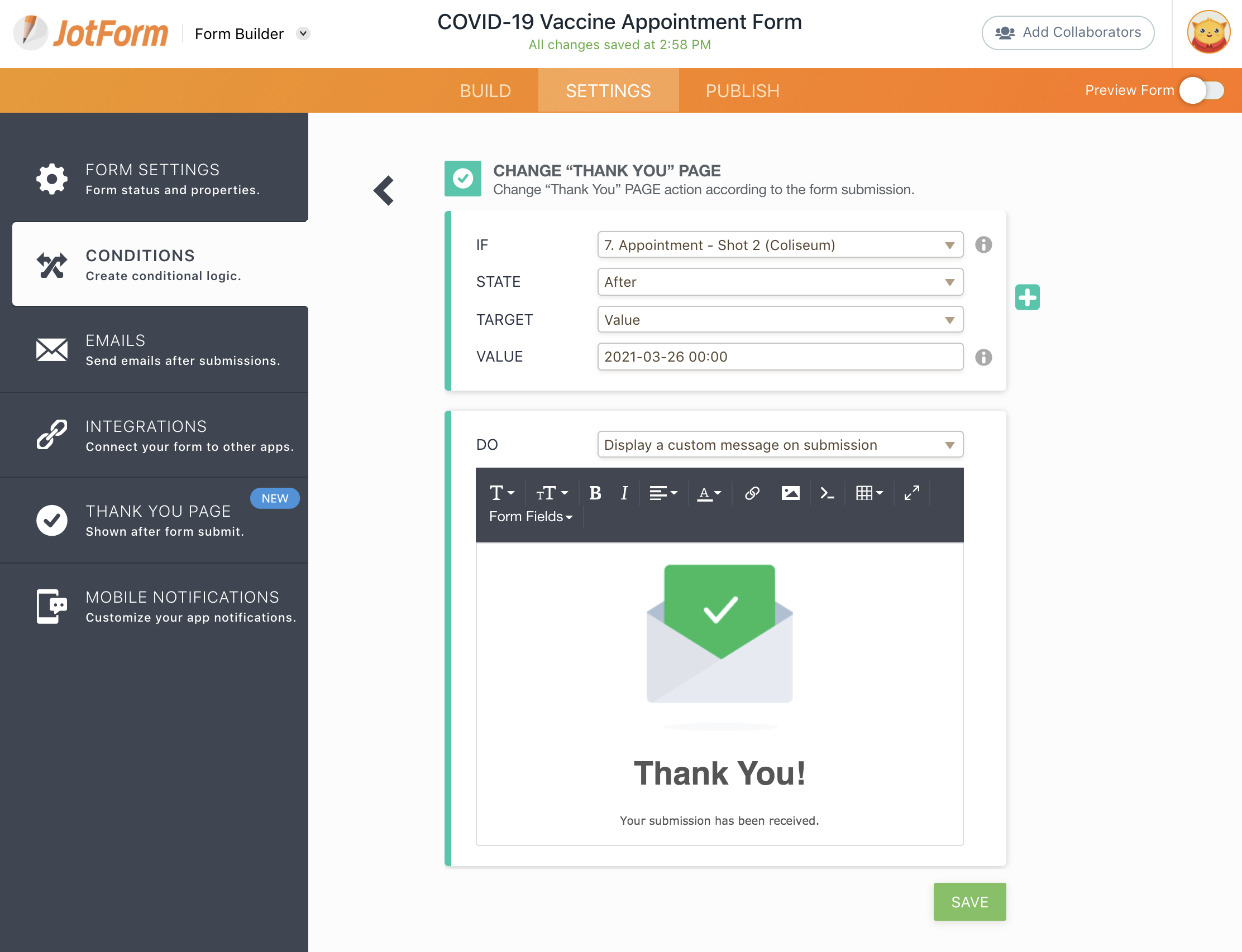 When people select an appointment on, before, or after a specific date, you can either redirect them to another website or show them a customized message after they submit your form. If you choose the latter option, Jotform’s conditional logic tool enables you to create a customizable message right then and there.