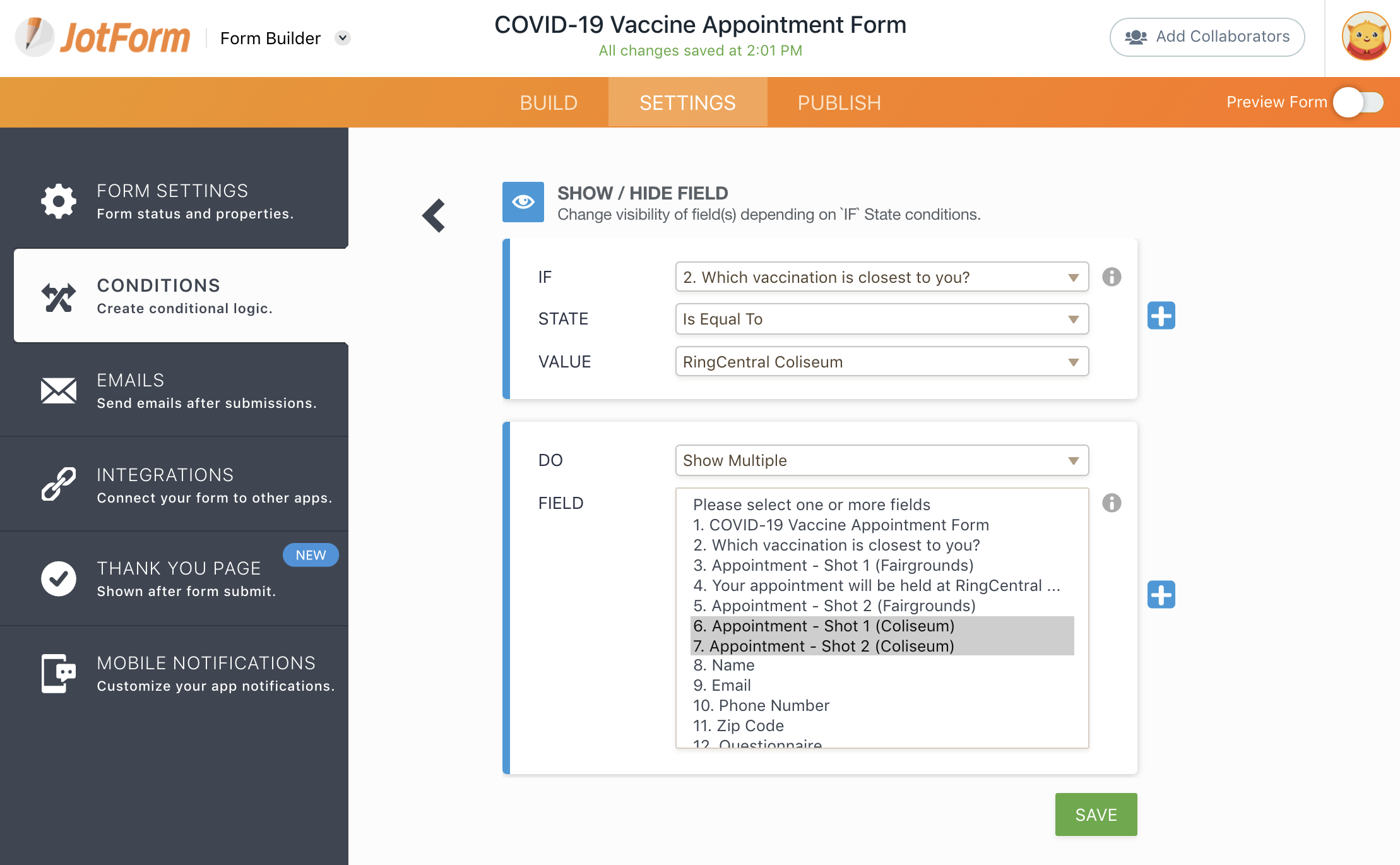 Conversely, selections made by form respondents can also show appointment fields that are at first hidden on your form. For instance, the hidden appointment field for a certain hospital can be shown when vaccine recipients select that location from a dropdown menu.