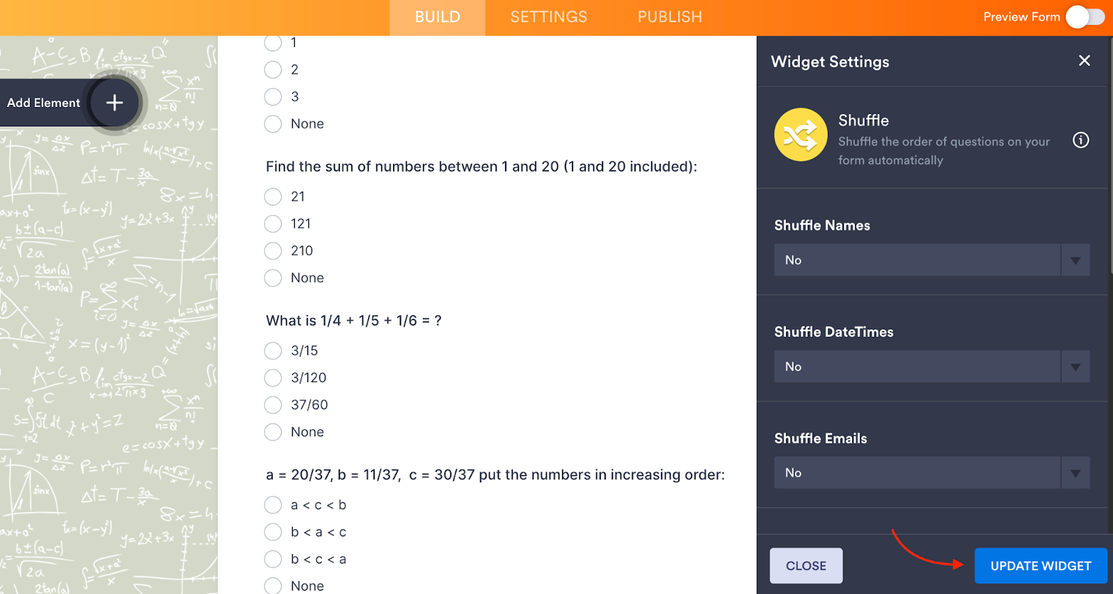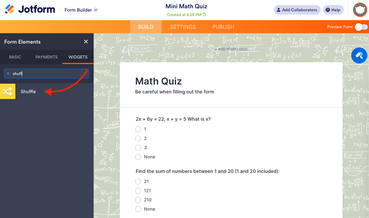 - Once the Shuffle widget is added, it will automatically randomize the order of your questions for each participant. You can further refine your quiz by using other advanced widgets: