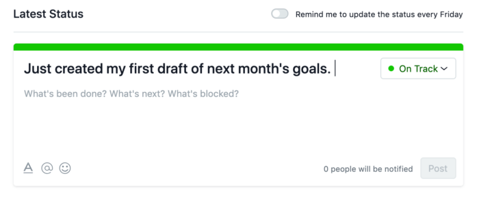 Projects are the individual goals or campaigns that you are tracking. They can be ongoing, such as “weekly marketing meeting” and “1:1 with direct report” or one-time projects such as “planning a team offsite” and “onboarding a new team member.”