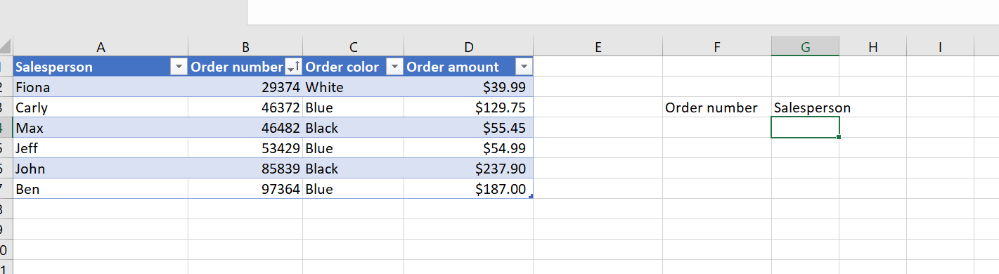 First, decide what data you’re looking for. In the example spreadsheet below, we want to find out which salesperson is responsible for a particular order, based on the order number.