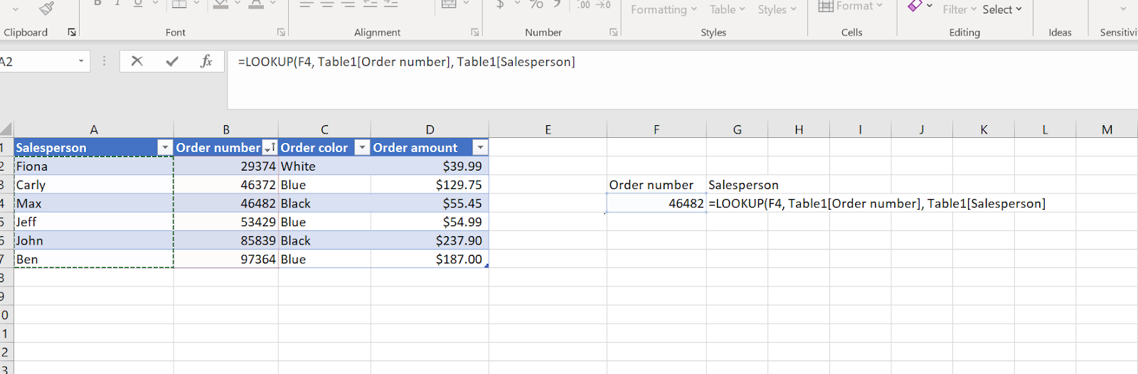 To look up any other order number, type it into the lookup value cell and click enter. The salesperson listed in the table for the order number will automatically appear.