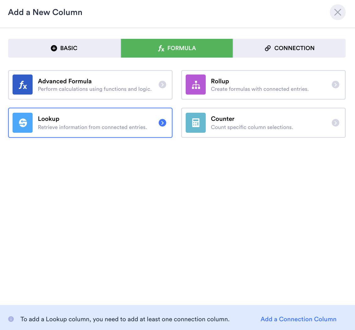To add a lookup column, click +Add in your table. Click the Formula tab in the Add a New Column dialog box, and select Lookup.