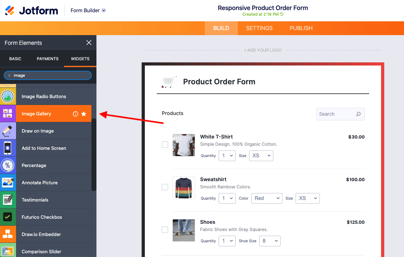To use the Image Gallery widget, simply go to Form Elements on the left of your Form Builder screen, and select the Widgets tab. You can either scroll to find the Image Gallery widget, or you can type it into the widget search bar. Then drag and drop it into the builder.