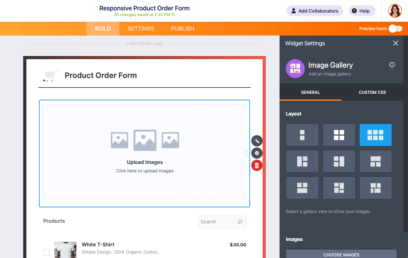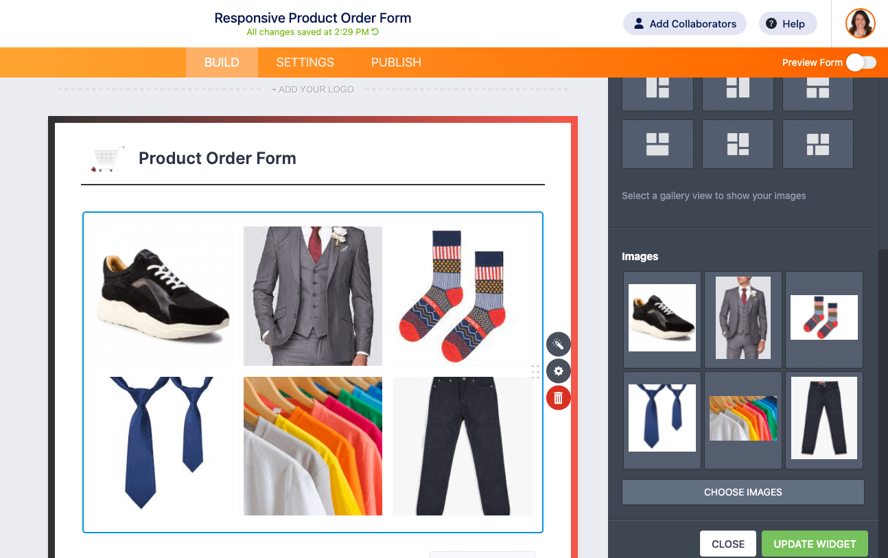Our Image Gallery widget lets you add a photo gallery to your form. This can be useful for order forms where you need to display a range of products or any other situation where a photo gallery would be appropriate — perhaps pictures of your team on a company app or photo reviews or testimonials. Whatever your need, the Image Gallery widget is easy to use and customize in seconds, with no coding required.