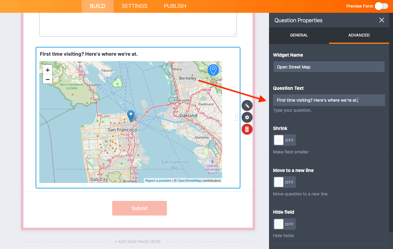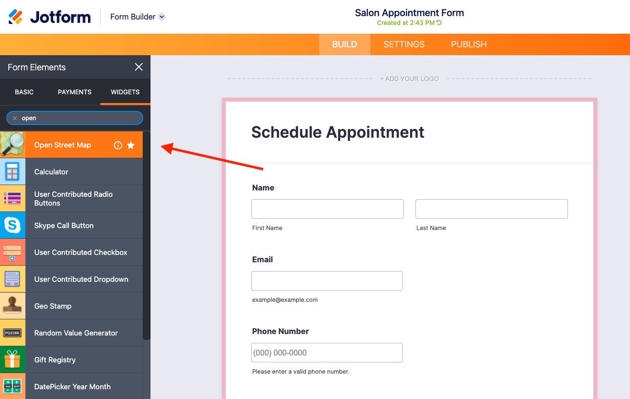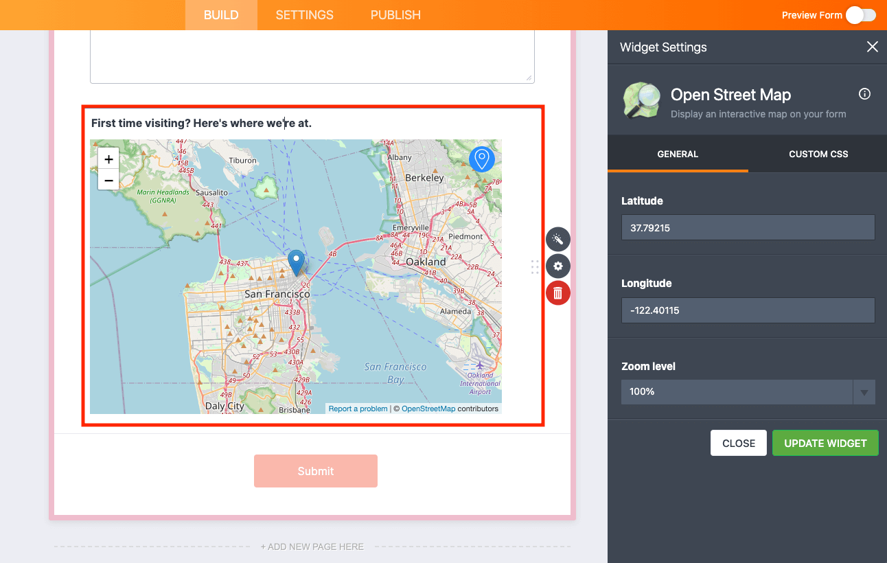 Powered by OpenStreetMap, it couldn’t be easier to get yourself “on the map” — literally. Simply find the OpenStreetMap widget under Widgets in Form Elements, and drag and drop it into the builder.