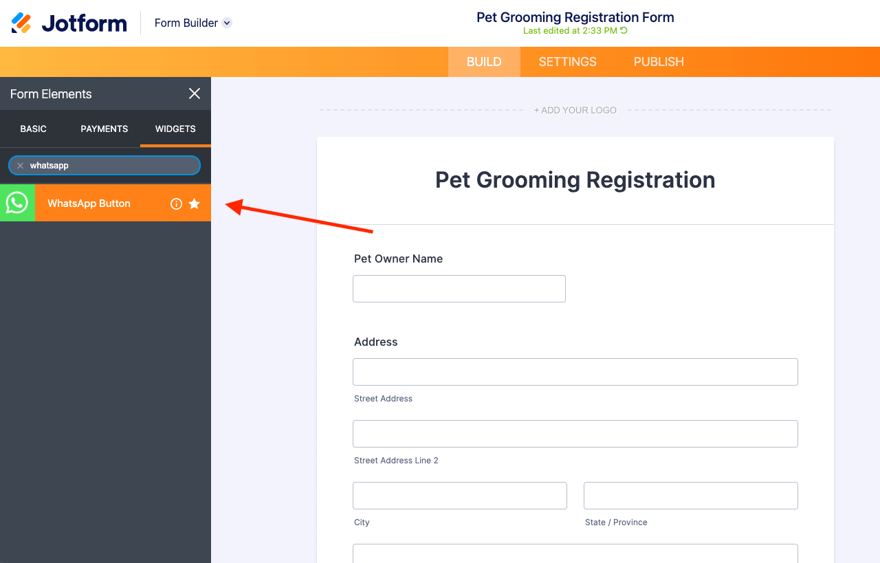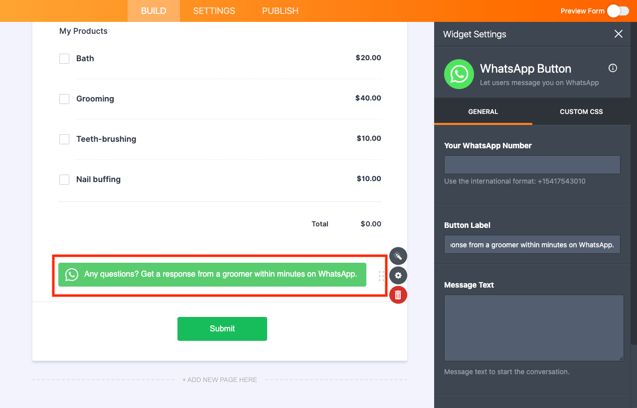 To get started, find the WhatsApp Button under the Widgets tab in Form Elements (or App Elements, if you’re creating an app), then drag it into your builder.