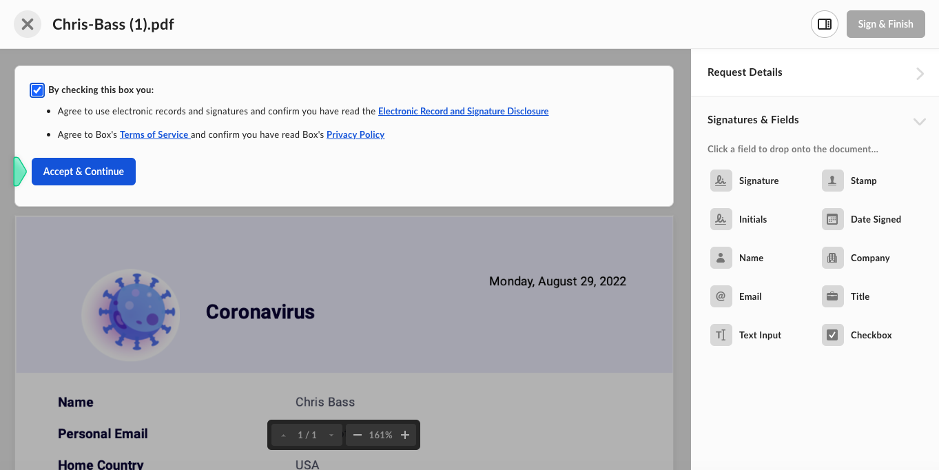 Plus, your signed documents will automatically be stored in the Box folder (and/or subfolders) you’ve designated, making for easy searchability and categorization of your files.