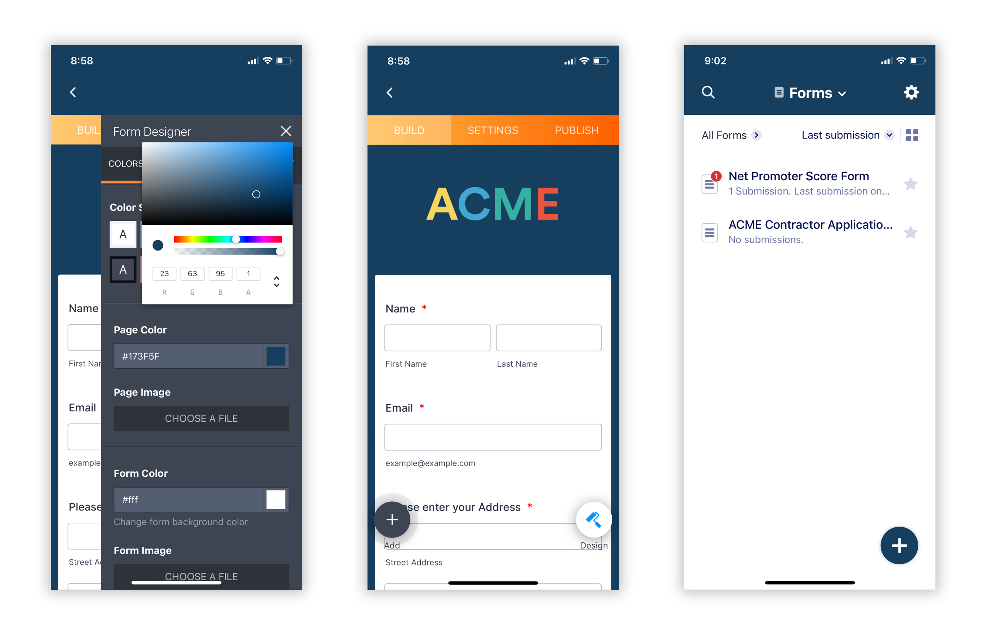 Here in the Form Designer, I’ve added the custom color palette for the Acme brand to a sample form that’s accessible to users. You can set your brand colors as the default when designing your form.