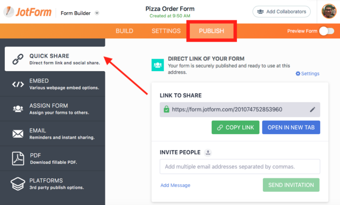 Once you’ve created a professional-looking form that meets your business’s needs, Jotform offers a number of ways to share your form with clients or customers.