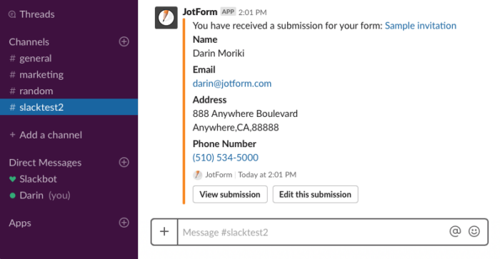Jotform’s new integration with Slack automatically sends team members a notification in a designated Slack channel once a form has been filled out.