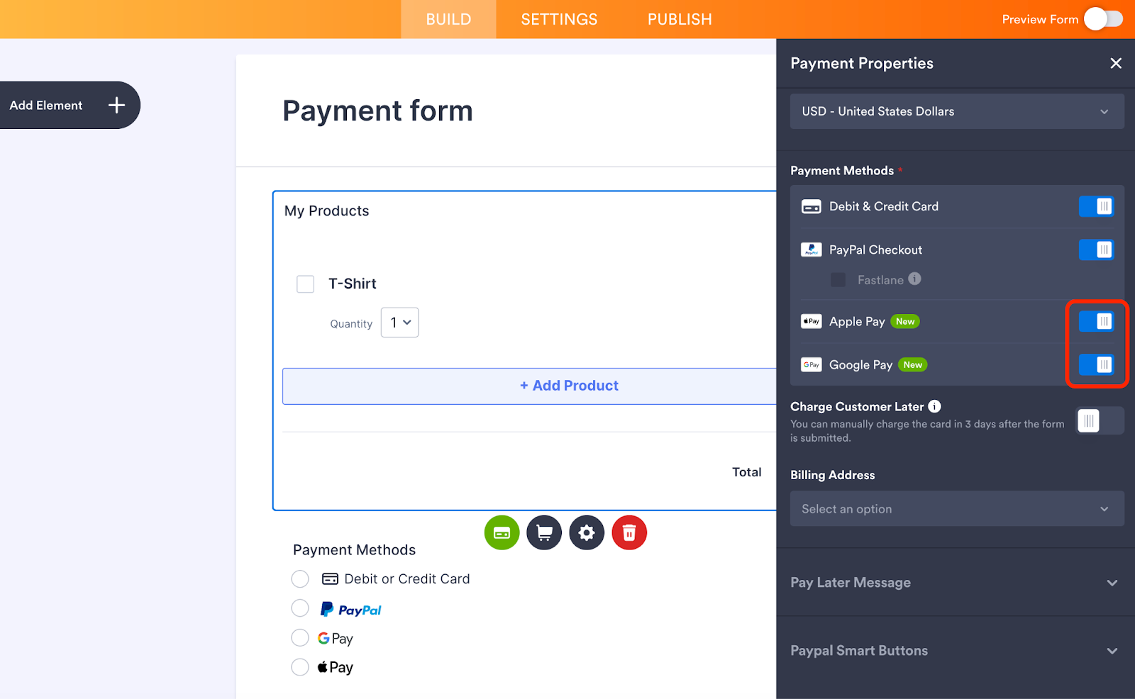 - Now, Apple Pay and Google Pay will appear as payment options in your form.