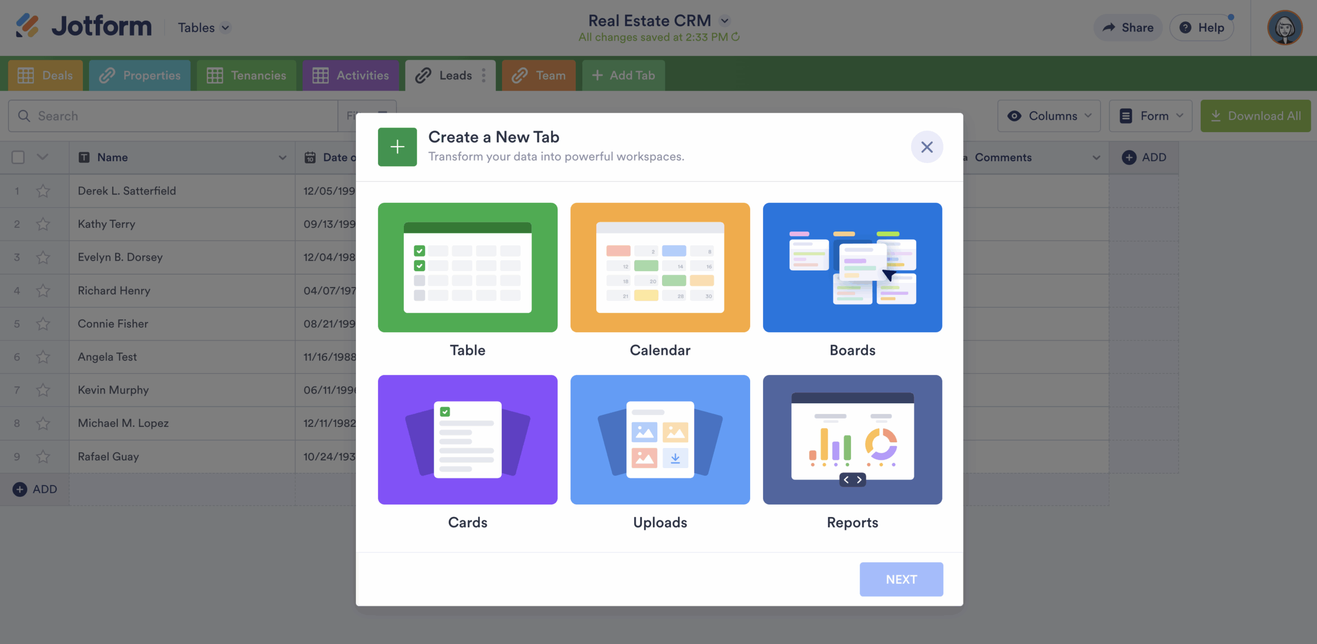 By connecting those online forms to a single Jotform Tables workspace, you can keep an eye on tenants, follow up on leads from potential clients, and see what colleagues have on their plate so you can assign tasks to them and move accounts through your pipeline without breaking a sweat.