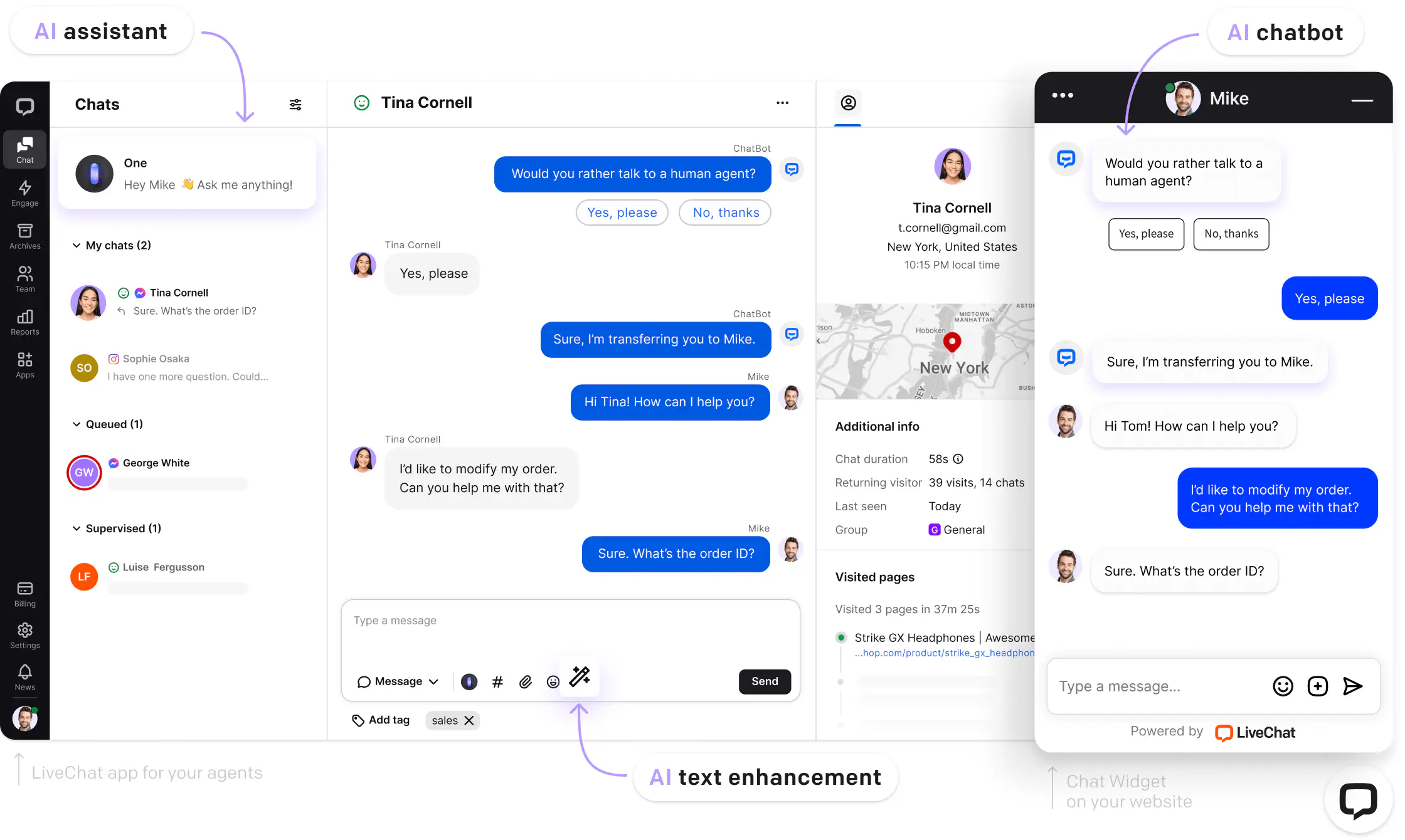 - Key features: Omnichannel support, AI-driven live chat, intelligent ticketing system