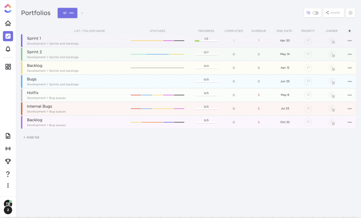 ClickUp’s interface is slightly different from the other platforms, as it centers on goals, objectives, and targets. Objectives are the overall desired outcome, and targets map out how to get there, including team sprints and individual targets that advance the overall objective. Team leaders can also set milestones, a feature that allows users to group tasks together.