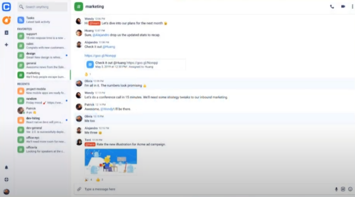 As with Teams and Slack, communication is divided into channels, with the option for private channels for focused topics, public team channels, one-way channels for announcements, and “Smart channels,” which automatically add team members based on chosen criteria. Unlike Teams, Flock allows unlimited free guests, making it more suitable for projects that require collaboration with other organizations.