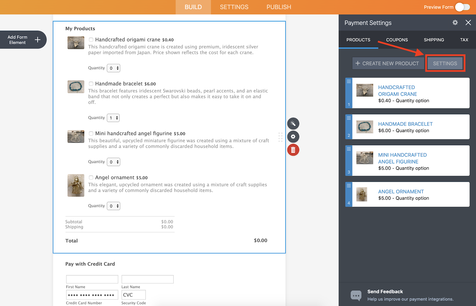 - Click on the Settings option under the Products tab in the Payment Settings menu.