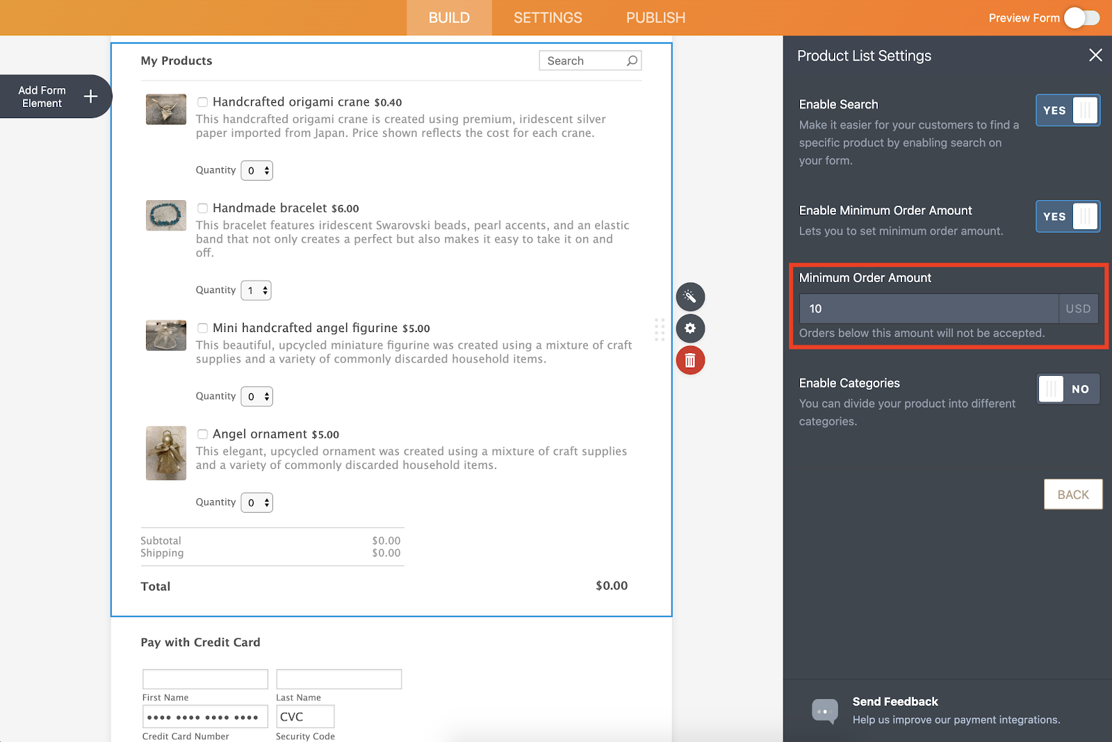 This minimum amount option is built into all of Jotform’s integrations with payment processors and ensures you’re not only covering the expenses tied to each order but also making a small profit.
