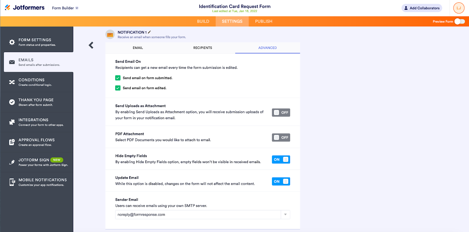 - Add notification emails to keep yourself and other form collaborators aware of submissions. Use the available form fields and customization options to tailor the email subject line, body copy, sender, and recipients. You can also include file uploads from form responses as attachments to speed response time and analysis of the information collected. Here’s a handy explainer on how to customize your emails.