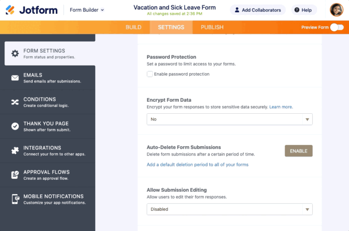 It’s likely that the Auto-Delete Submissions feature is already popular because it’s easy to find. You can access it directly from the Form Builder to set auto-delete rules for a single form. If you want to set rules for all your forms at once, you can do so from your account settings.