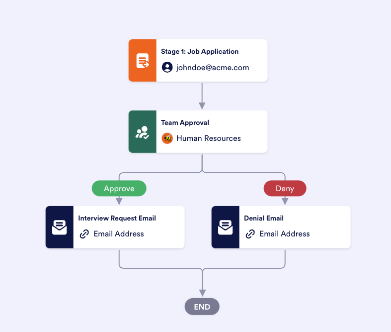 We’ll start with a job application form to collect applicant information. Using Jotform Approvals, we can create a workflow to automatically send completed applications to the HR team. The HR team can then approve or deny the initial application.
