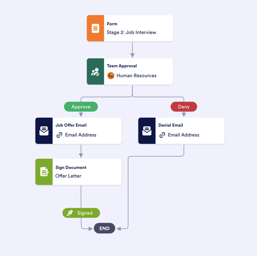 We can then add the Calendly scheduling form to our workflow. Just like with the initial application, we can automatically collect approvals from the HR team after the interview. If the applicant is accepted, they will automatically receive a Jotform Sign offer letter document via email.