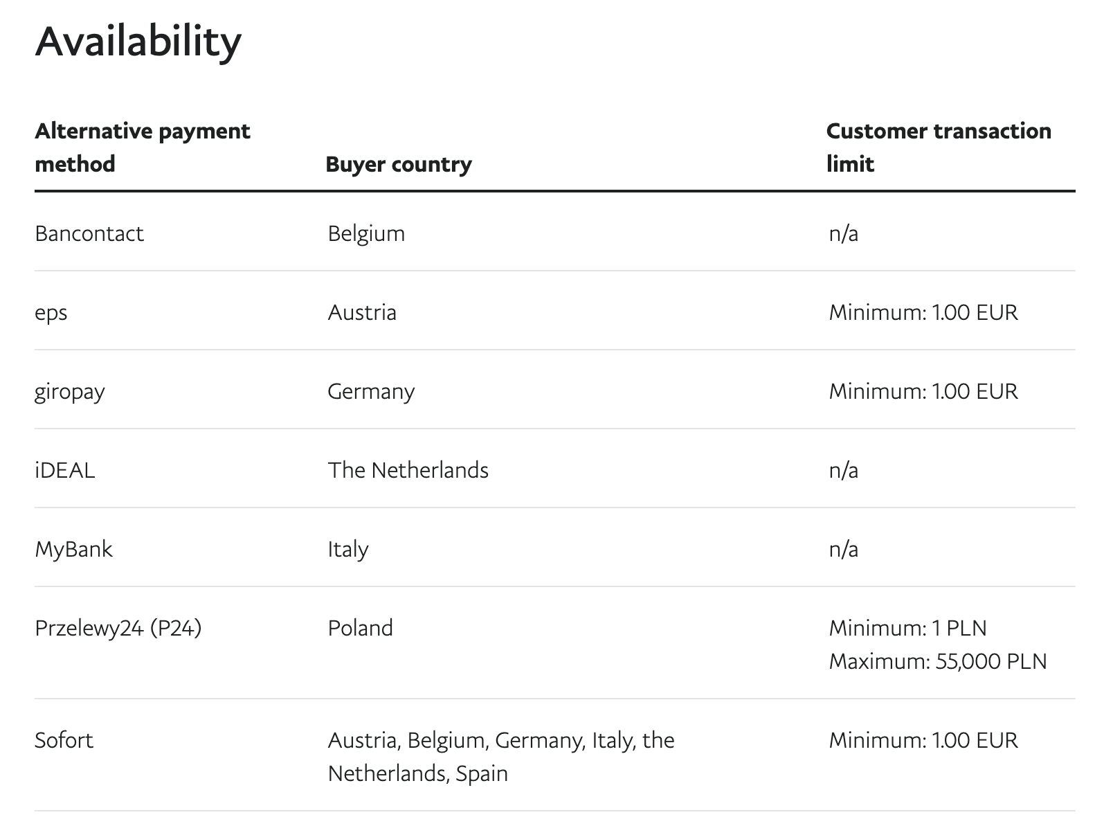 Alternative payment options aren’t available to merchants in Brazil, Japan, and Russia. Since PayPal Commerce Platform doesn’t support cross-border shipping for alternative payment methods, buyers will receive a message saying that the shipping address is invalid when items are destined for a country where a specific alternative payment method isn’t supported.