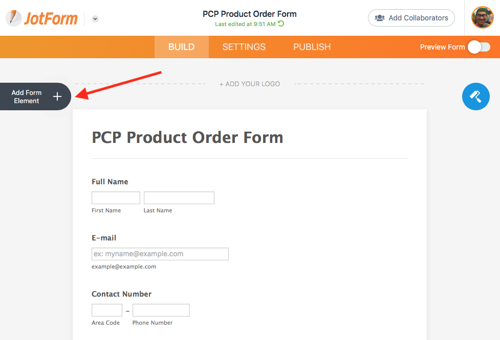 - Get started by clicking on the Add Form Element icon on the left side of your screen while you’re creating or editing an online payment form.