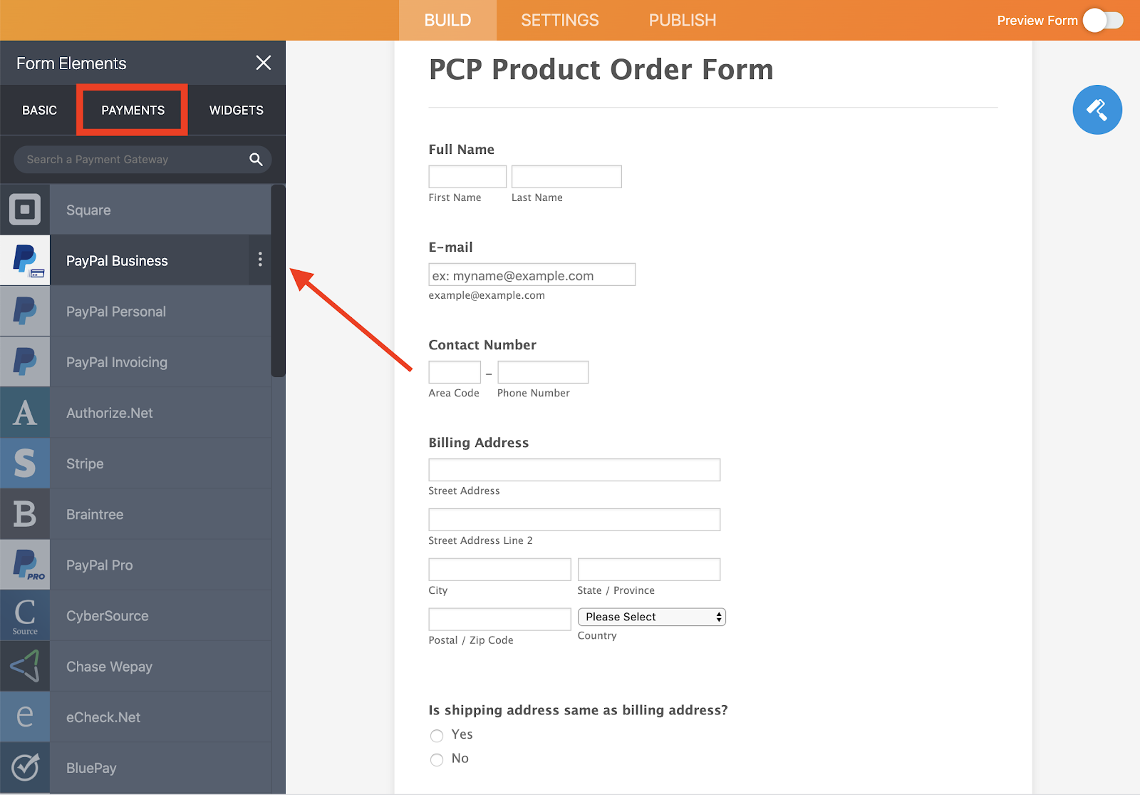 - Click on the Payments tab in the Form Elements menu, and select PayPal Business in the dropdown menu that appears.