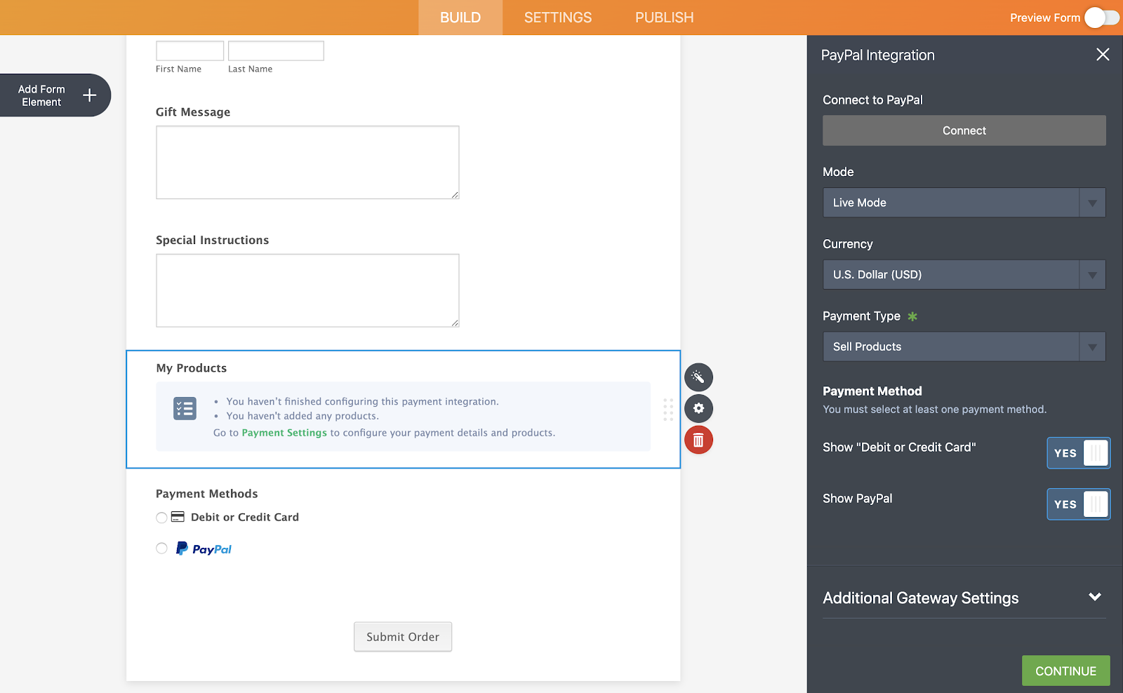 - A payment field for PayPal Business will appear on your form. The Payment Settings menu, which you’ll use to set up the integration, will appear on the right side of your screen.