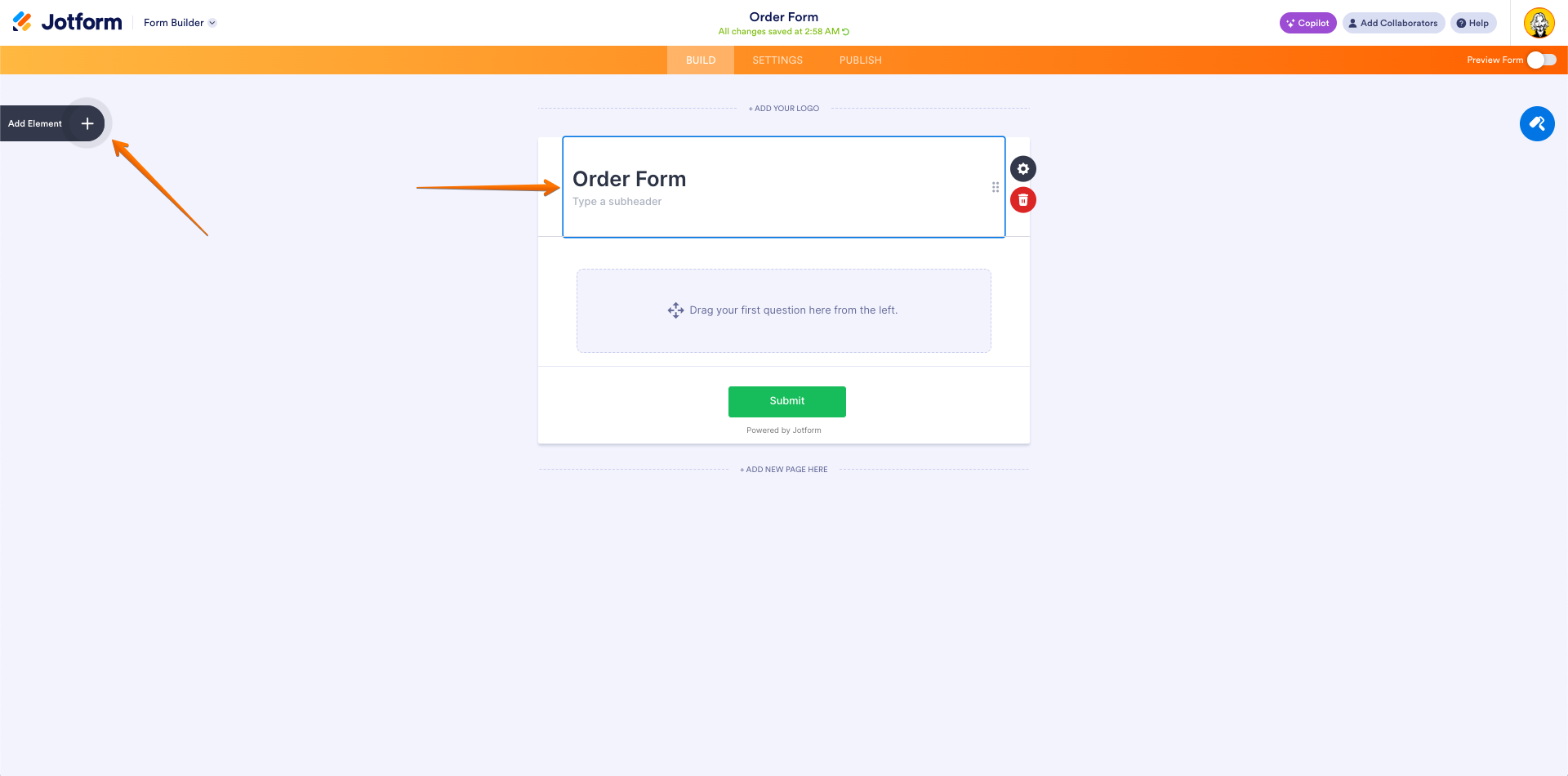 - Click on the Add Element button on the left side of the Form Builder to open the Form Elements menu.