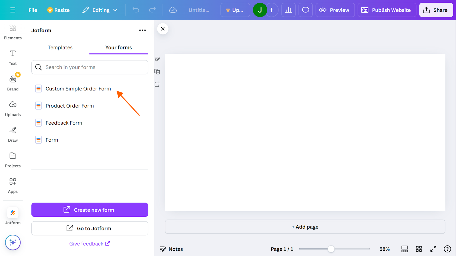 But creating and uploading the order form you need can be a pain without the right tools. This is where Jotform can help — by streamlining your form-creation process from start to finish. And if you made your website with Canva, integrating these forms for easy management takes just a few clicks.