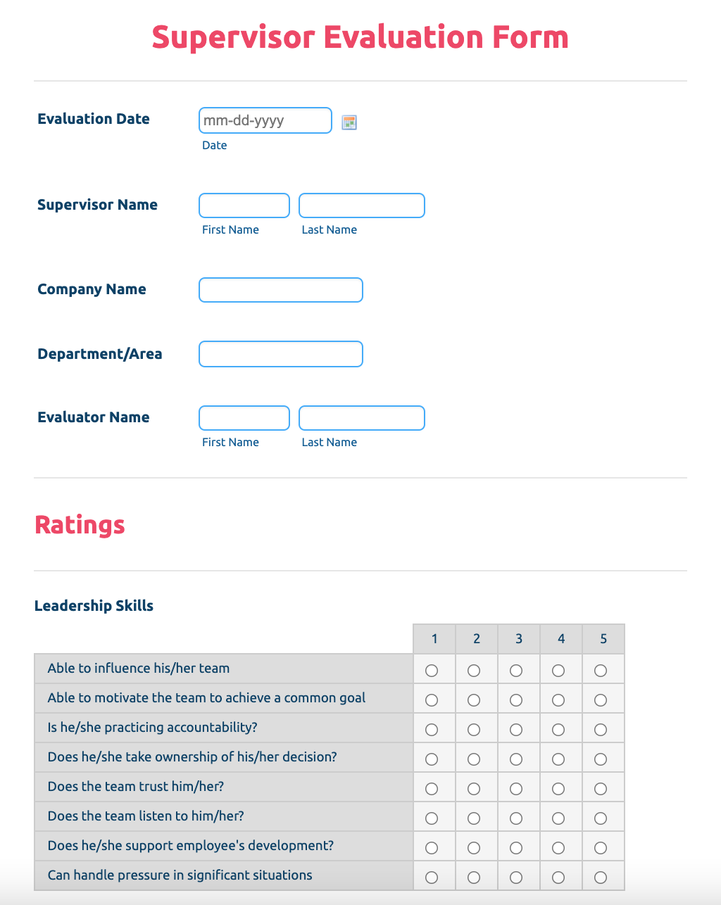 The differences in these performance evaluations are less significant than the cooperative, collaborative approach they share. No matter which approaches you choose, you can make the process easier at your organization by using Jotform employee evaluation templates. These templates are tailored to different jobs in a variety of industries, and you can customize any of them to fit your specific circumstances and goals.