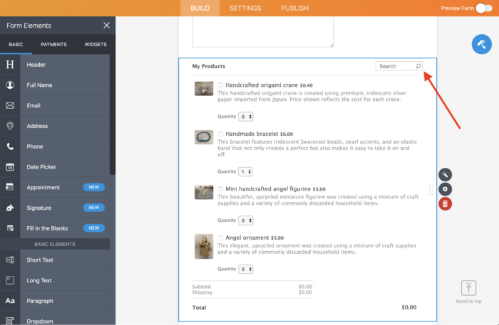 When customers use the search box beside your list of products, Jotform’s search tool will filter the items you’re selling and only display relevant options that include the words or phrases customers are trying to find. The search tool narrows down options by locating words or phrases within the names and descriptions for each product.