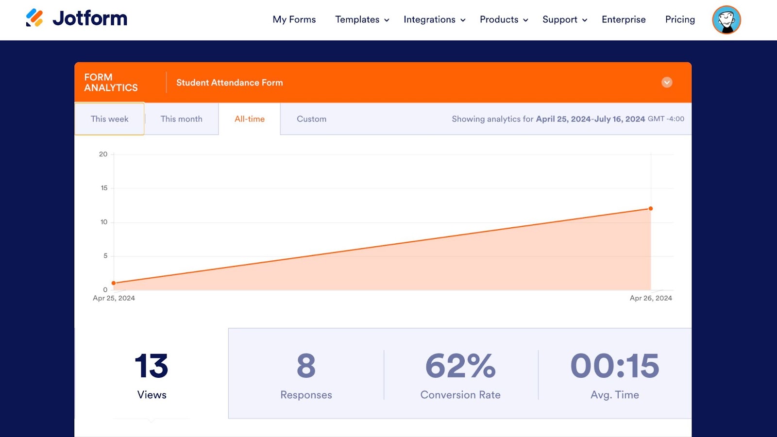 Jotform’s Form Analytics feature can also help you understand how your survey is performing. Use this tool to review details like form traffic, engagement time, devices used, and more to see how you can improve the overall survey experience.